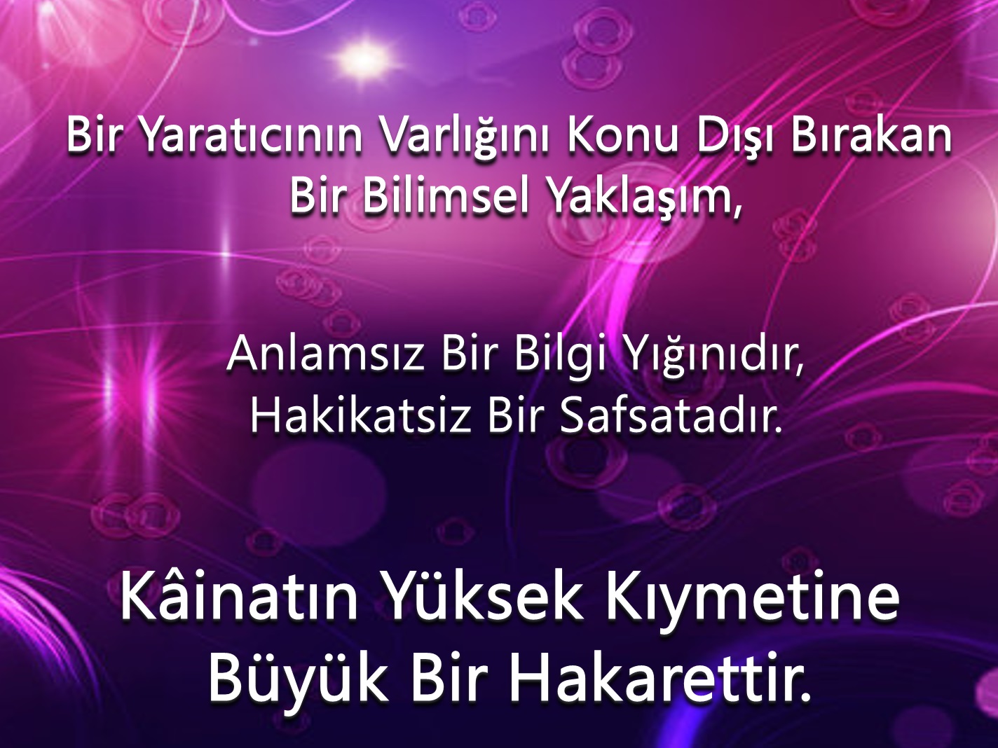Bir yaratıcının varlığını konu dışı bırakan bir bilimsel yaklaşım, anlamsız bir bilgi yığınıdır, hakikatsiz bir safsatadır ve kâinatın yüksek kıymetine büyük bir hakarettir.