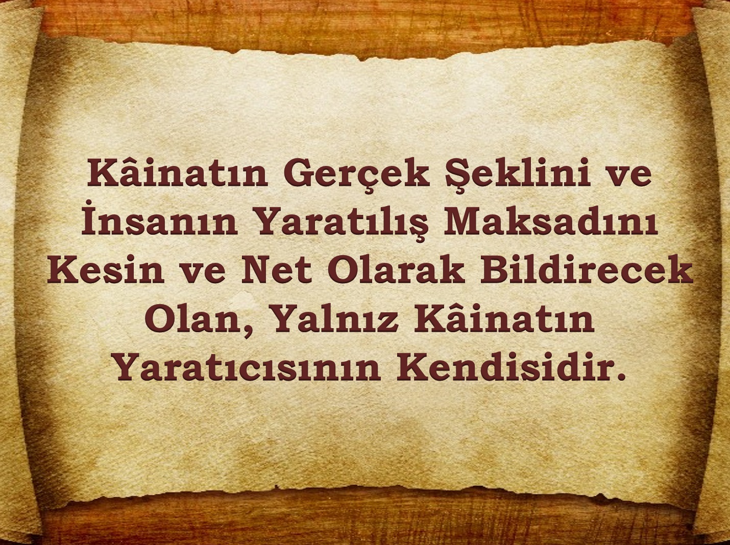 Kâinatın gerçek şeklini ve insanın yaratılış maksadını kesin ve net olarak bildirecek olan, yalnız kâinatın yaratıcısının kendisidir.