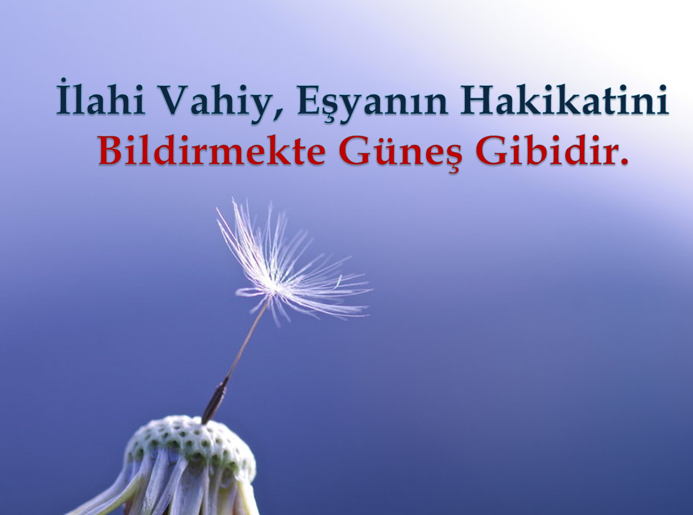 İlahi vahiy, eşyanın hakikatini bildirmekte güneş gibidir. Nasıl ki, güneş eşyayı aydınlatarak varlığını ortaya çıkarıp gösterir. İlahi vahiy olan Kur’ân da, eşyanın hikmetini, hakikatini, gayesini, manasını saklı oldukları yerlerden çıkarır ve gerçek mahiyetinin ne olduğunu gösterir. Nasıl ki zifiri karanlık bir meydanda hiç bir eşyanın varlığı bilinmez ve görülmez. Kur’ân güneşi olmadan da, sönük bir el feneri gibi olan akıl tek başına kullanılırsa, eşyanın hakikati gerçek şekliyle bilinmez ve görülmez. Aklın tek başına gördüğü kısmı ise, karmakarışık ve bulanık suretlerden ibaret kalır. Yaratıcıyı konu dışı bırakan ve güya bilimsel olduklarını iddia eden yaklaşımlar, kâinattaki her şeye sadece kendileri hesabına bakar, yani onları yapan usta ve sanatkârı işin içine katmaz. Durum böyle olunca ne olur? En manalı ve kıymetli bir sanat eseri olan tabiatın derin manalarının tamamı gizlenir, manevî yüksek kıymeti saklanır, hiçe iner, sadece maddesi itibarıyla bir değeri kalır. O da ne kadardır ki zaten?