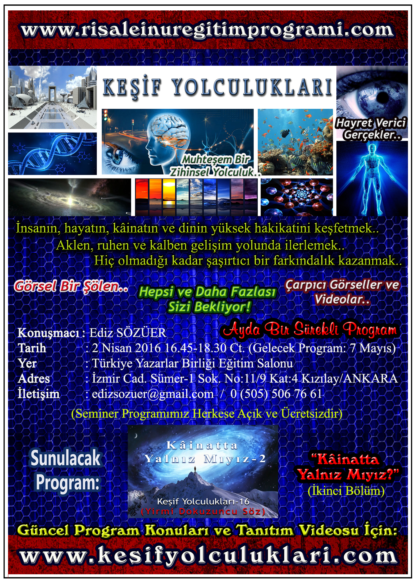 Yazarlar Birliği Mevlana Divanı Eğitim Salonu’nda Dev Projeksiyon Ekranı ve Hoparlör sistemi ile görsel destekli olarak sunulan, HERKESE AÇIK VE ÜCRETSİZ olarak yapılan Risale-i Nur eğitim programımızın duyurularından haberdar olmak için Facebook Grubumuza üye olunuz: https://www.facebook.com/groups/kesifyolculuklari/