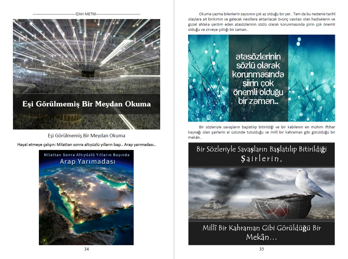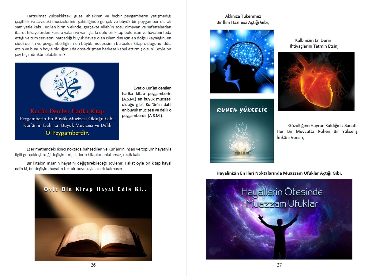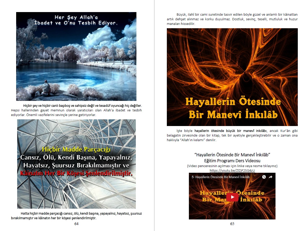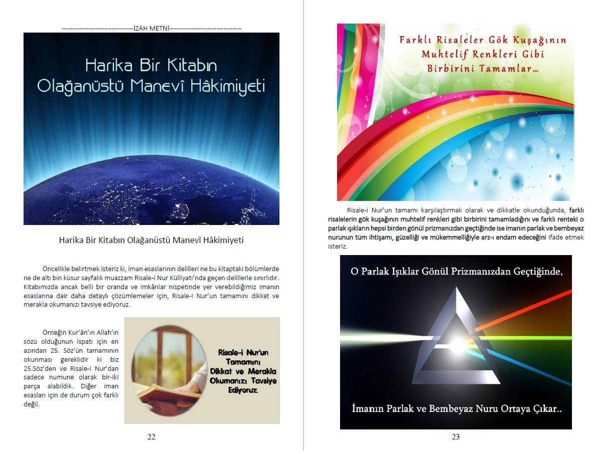 GÖRSELLER HAKKINDA: Konu anlatımlı şemalar, metin vurguları ve etkileyici resimlerden oluşan görseller, daha önce sunulan Keşif Yolculukları Risale-i Nur Eğitim Programı derslerimizin sunumlarından titizlikle alındı, geliştirildi ve kitap metni içine entegre edildi. Normalde 89 sayfa olan kitabımızın hacmi görsellerle 159 sayfaya çıktı. (Ana metin ise 39’ten 102’ye çıktı) Yani bu kitapta görsellik oranı %62! Bu gerçekten çok yüksek bir oran.