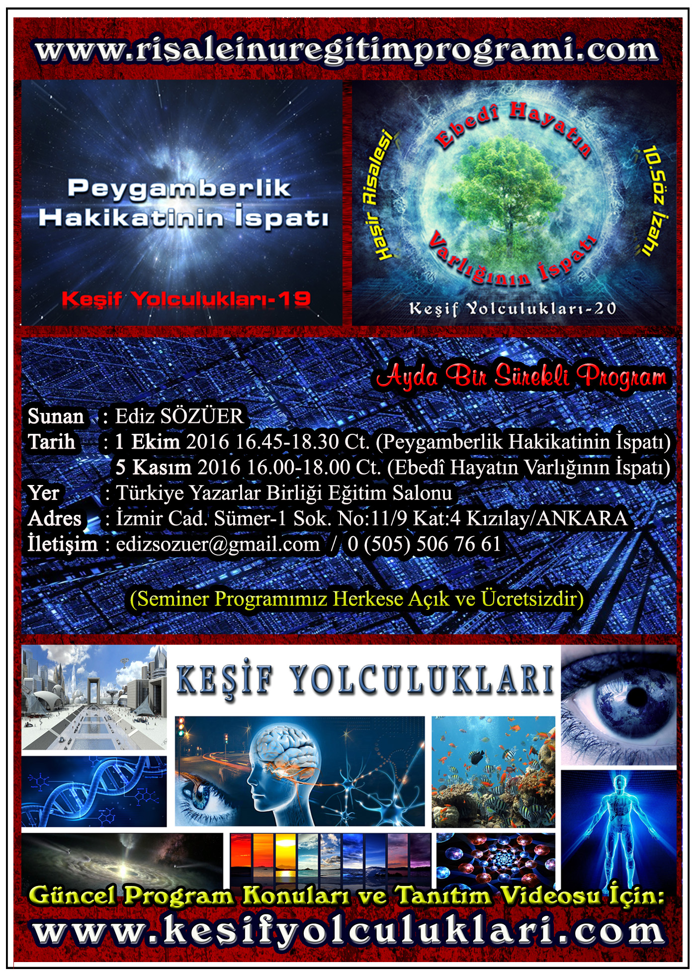 Yazarlar Birliği Mevlana Divanı Eğitim Salonu’nda Dev Projeksiyon Ekranı ve Hoparlör sistemi ile görsel destekli olarak sunulan, HERKESE AÇIK VE ÜCRETSİZ olarak yapılan Risale-i Nur eğitim programımızın duyurularından haberdar olmak için Facebook Grubumuza üye olunuz: https://www.facebook.com/groups/kesifyolculuklari/