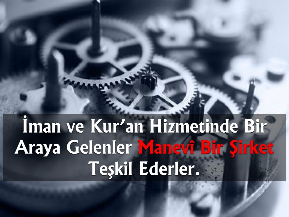 İman ve Kur’an hizmetinde bir araya gelenler manevî bir şirket teşkil ederler. Ticaret sahasında elbette kişinin bir şirkete ortak olması şart değildir. Ancak bu zamanda ferdî sermaye ile edinilecek kârlar, şirketleşen büyük firmalar karşısında nasıl çok cılız kalır ve rekabet gücünü büyük ölçüde kaybederse, ferdî gayretlerle yapılan ibadetler veya hizmetler de, bir araya gelinerek cemaat halinde yapılan gayretler yanında öyle güçsüz kalırlar. Böyle manevî bir gücü kim bu zamanda yanında bulundurmak istemez ki? Hem cemaat halinde yapılan dersler ve bir araya gelmek sayesinde, fertlerin güzel ahlak ve seciyeleri birbirine yansır. Ayrıca ders mütalaasında daha fazla feyiz ve zevk alırlar, birbirlerini tamamlarlar.