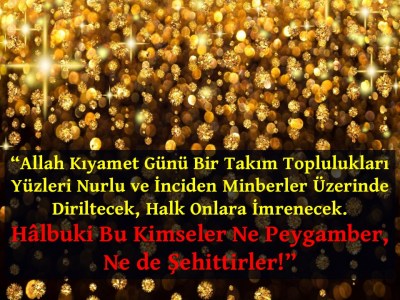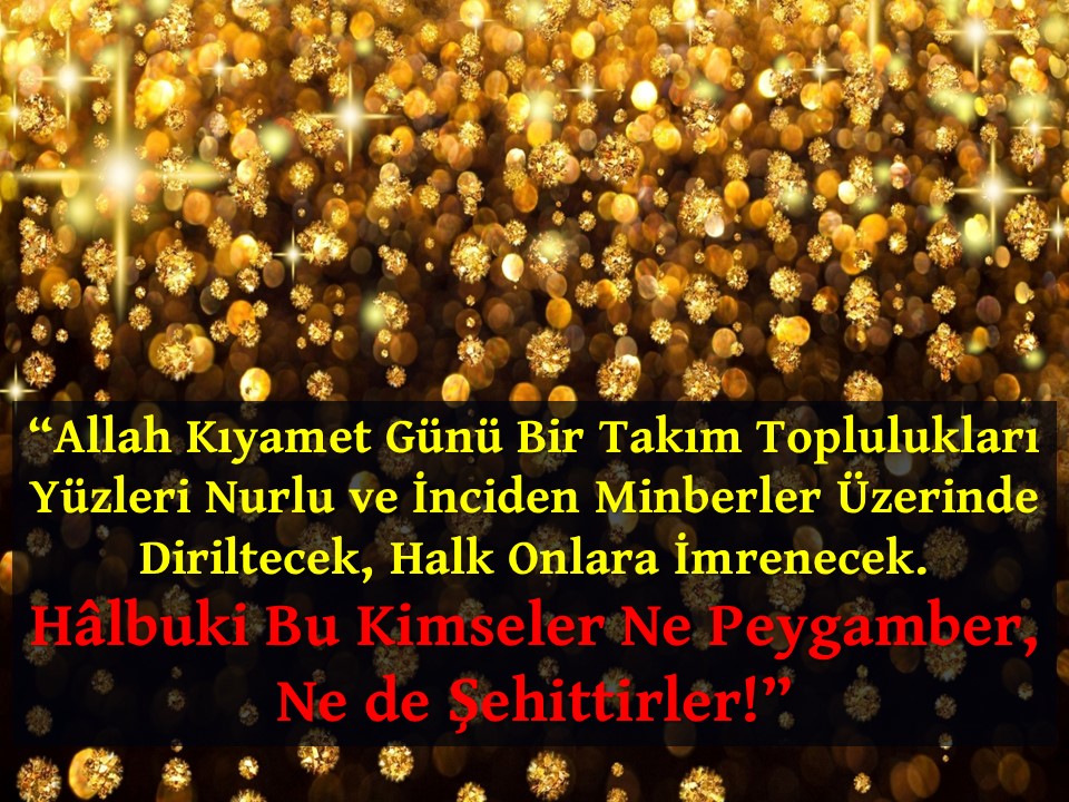 “Allah kıyamet günü bir takım toplulukları yüzleri nurlu ve inciden minberler üzerinde diriltecek, halk onlara imrenecek. Hâlbuki bu kimseler ne peygamber, ne de şehittirler!”