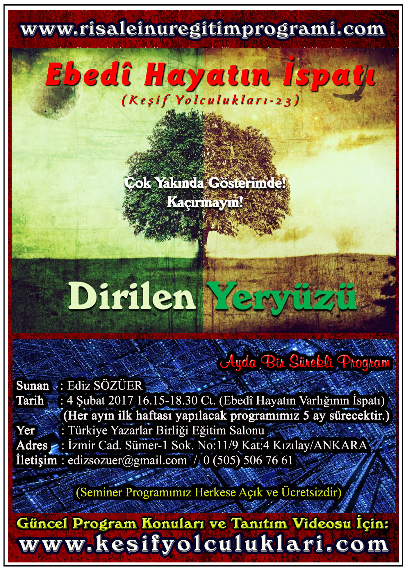 Yazarlar Birliği Mevlana Divanı Eğitim Salonu’nda Dev Projeksiyon Ekranı ve Hoparlör sistemi ile görsel destekli olarak sunulan, HERKESE AÇIK VE ÜCRETSİZ olarak yapılan Risale-i Nur eğitim programımızın duyurularından haberdar olmak için Facebook Grubumuza üye olunuz: https://www.facebook.com/groups/kesifyolculuklari/