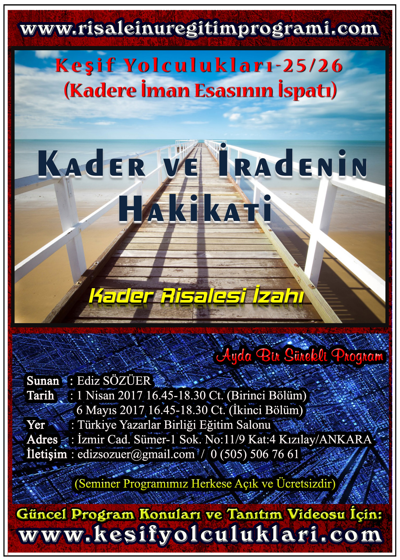NOT: Risale-i Nur Eğitim Programı’mızın dördüncü ve sonuncu eğitim dönemi, birer ay arayla iki parçada sunulacak “Kader ve İradenin Hakikati (Kader Risalesi İzahı)” ile tamamlanacak inşallah. Önceki derslerimize aşağıdaki eğitim takip sayfasından ulaşabilirsiniz….