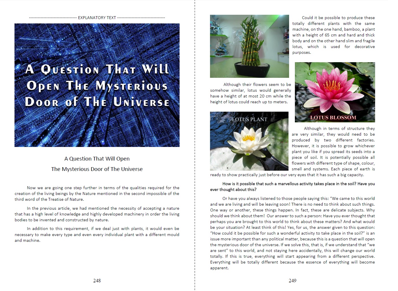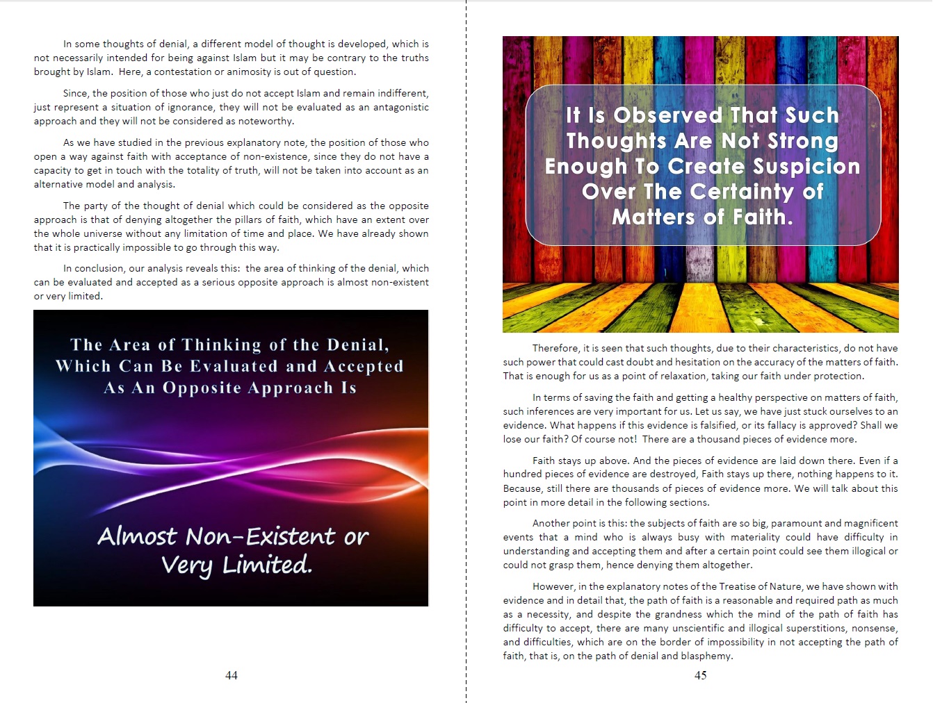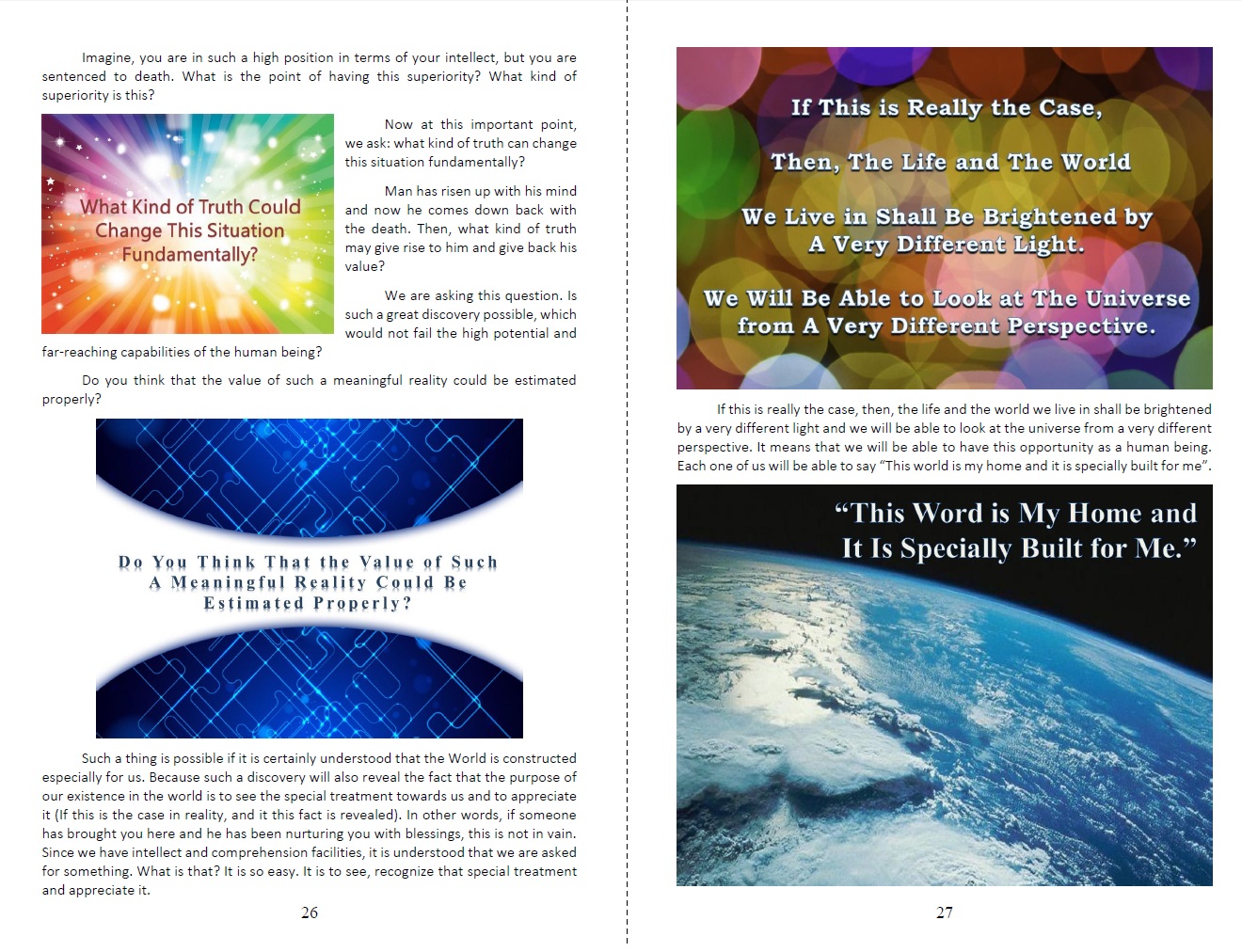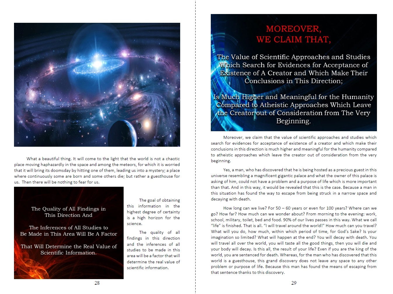 Tüm insanlığın ihtiyacı olan ve varlığın temel gerçekliğini arayan herkese hitap eden ve bilim dünyasını ve bilim insanlarını daha da derinden ve yakından ilgilendiren ve ilahî vahyin eliyle getirilen yüksek hakikatler, bu eserlerle yeniden keşfediliyor ve aklî metotlarla tamamen ispat ediliyor.