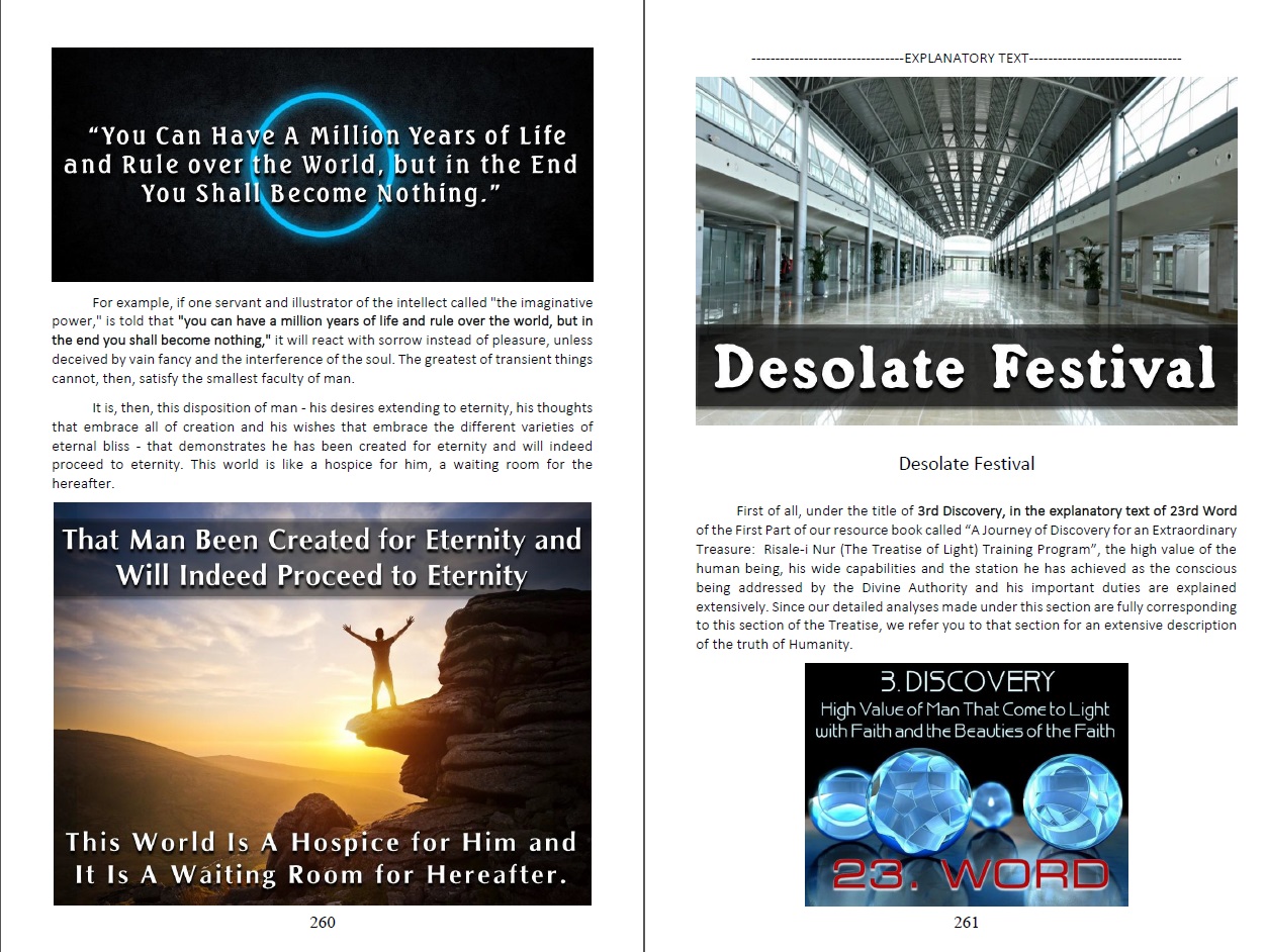 This work is a part of our basic/source book called “A Journey of Discovery for an Extraordinary Treasure: Risale-i Nur (The Treatise of Light) Explanatory Notes” upon which our “Journeys of Discovery, Risale-i Nur Training Program” is constructed and it is the proof of the Existence of Resurrection and the Eternal Life, which is the Fifth Truth of the Six Truths, dealt with in the second main part of that book, which is called “Proving the Existence of the Treasure of Faith with Evidence”.
