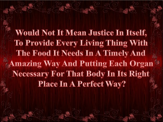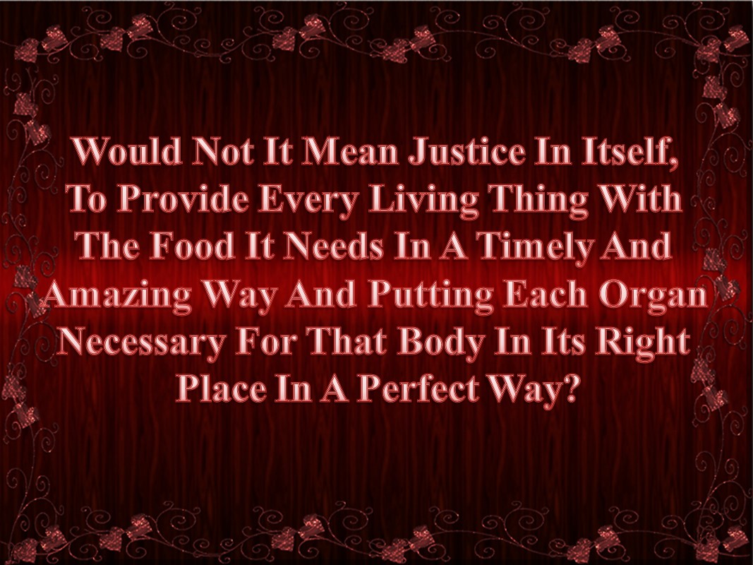 Whereas, if he could think for a while and ask himself the following: Would not it mean justice in itself, to provide every living thing with the food it needs in a timely and amazing way and putting each organ necessary for that body in its right place in a perfect way?