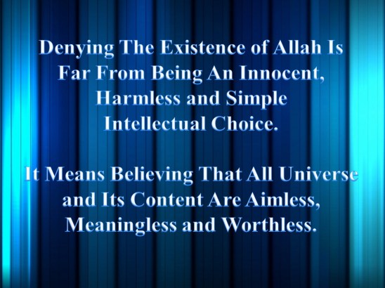 As mentioned earlier, denying the existence of Allah is far away from being a simple, harmless and innocent choice of opinion and it means believing that the whole universe and the things existing within it are useless, aimless, worthless and meaningless.