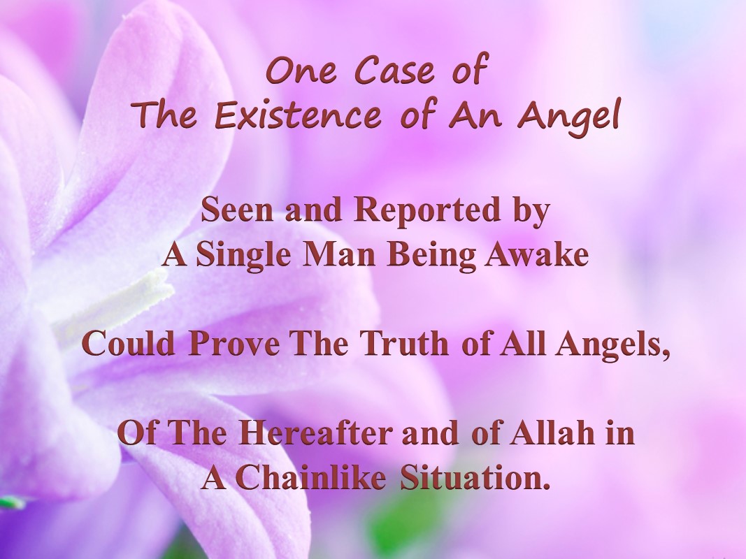 Even the trueness of a case where a single man sees an Angel while he is awake and informs others about that situation, proves and shows successively the trueness of the existence of all angels, thereafter and Allah.