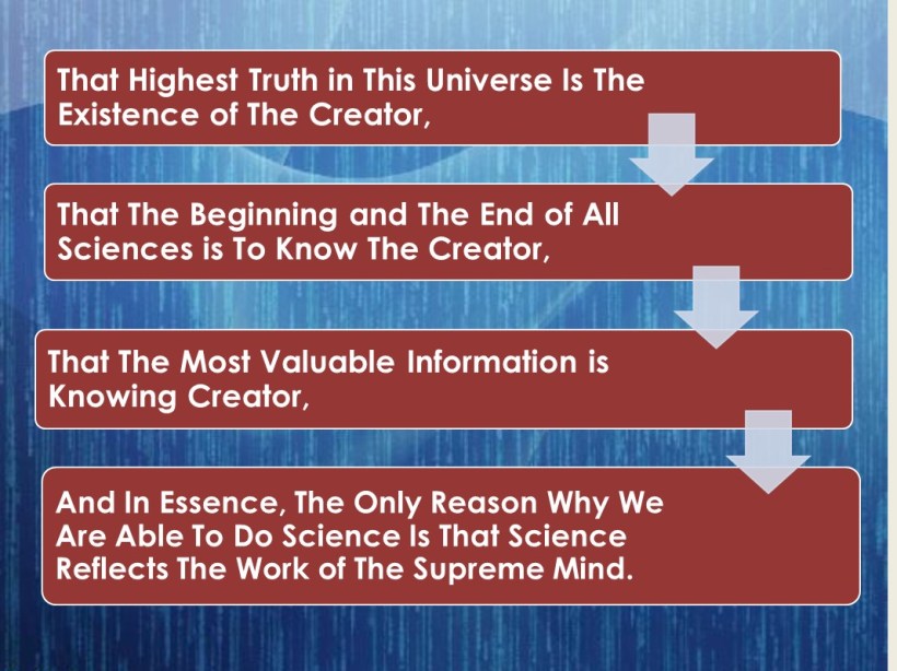 “That highest truth in this universe is the existence of the creator, that the beginning and the end of all sciences is to know the Creator and that the most valuable information is knowing Creator and in essence, the only reason why we are able to do science is that science reflects the work of the Supreme Mind.”