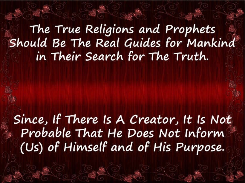 “Moreover, true religions and prophets should be the real guide of humanity on the way to search the truth. Because, if there is a Creator, it would not be possible to expect Him not to inform of Himself and of the purpose of creation.”