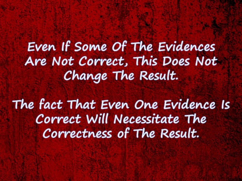 Let us say, we have just stuck ourselves to an evidence. What happens if this evidence is falsified, or its fallacy is approved? Shall we lose our faith? Of course not! There are a thousand pieces of evidence more. Faith stays up above. And the pieces of evidence are laid down there. Even if a hundred pieces of evidence are destroyed, Faith stays up there, nothing happens to it. Because, still there are thousands of pieces of evidence more. We will talk about this point in more detail in the following sections.