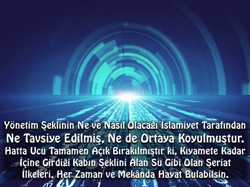 Yönetim şeklinin ne ve nasıl olacağı ise İslamiyet tarafından ne tavsiye edilmiş, ne de ortaya koyulmuştur. Hatta ucu tamamen açık bırakılmıştır ki, kıyamete kadar içine girdiği kabın şeklini alan su gibi olan şeriat ilkeleri, her zaman ve mekânda hayat bulabilsin.