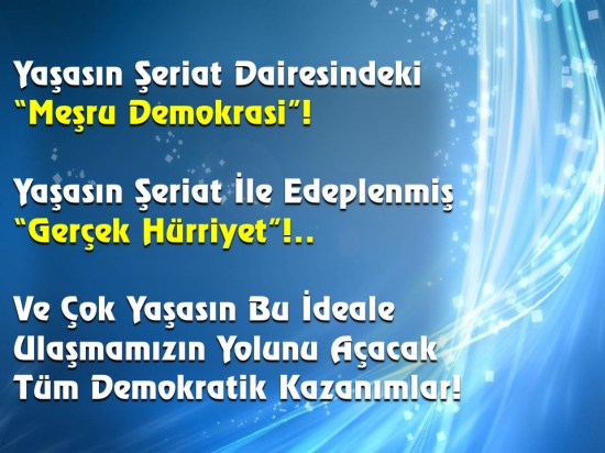 Temel şeriat kaidelerine herkesin uyması şartıyla, halkın kendi kendini yönettiği “meşru” bir yönetim şekline, yani “meşru bir demokrasi”ye taraftarız. Bunu bekliyor ve istiyoruz. Bu aşamada asla zarar etmeyen tatbikattaki yanlış ve ihmallerin ise insanlardan kaynaklandığını, bu yanlış ve eksikliklerin toplumca düzelerek yine milletçe bizim düzelteceğimizi ve geliştireceğimizi unutmamak lazımdır.