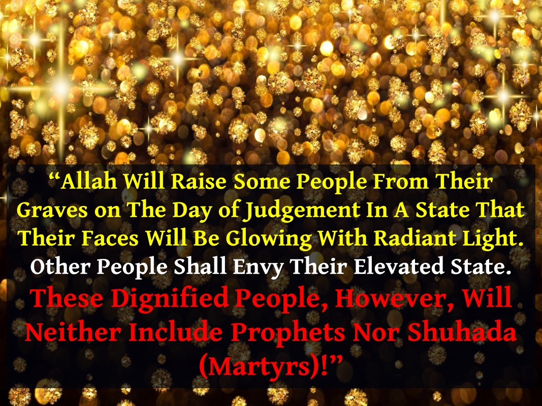 “Allah will raise some people from their graves on the Day of Judgement in a state that their faces will be glowing with radiant light. They shall be seated on pulpits made of pearls. Other people shall envy their elevated state. These dignified people, however, will neither include Prophets nor Shuhada (martyrs).”