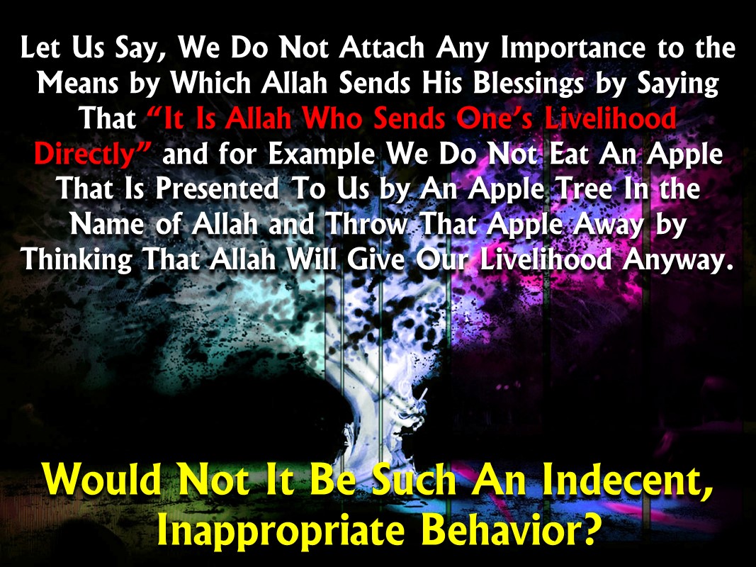 Let us say, we do not attach any importance to the means by which Allah sends his blessings by saying that “It is Allah who sends one’s livelihood directly” and for example we do not eat an apple that is presented to us by an apple tree in the name of Allah and throw that apple away by thinking that Allah will give our livelihood anyway. Would not it be such an indecent, inappropriate behavior? Wouldn’t this act, which means risking dying of starvation, represent courage of ignorance, showing a great disrespect to Allah?