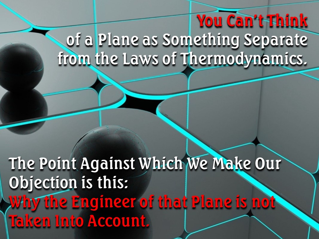 You can’t think of a plane as something separate from the laws of thermodynamics. The point against which we make our objection is this: why the engineer of that plane is not taken into account.