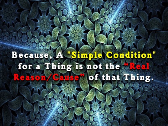 Because, a “simple condition” for a thing is not the “real reason/cause” of that thing. If you do not give water to a garden, it dries out. Just by looking at this fact, it can’t be said that water is the sole reason of existence of the plants in the garden. This is what we are trying to explain.