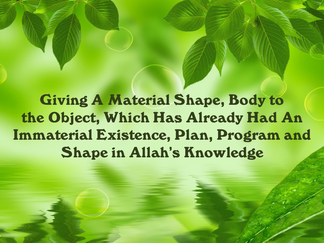 1- If we accept that matter and objects are invented and created out of nothing by a single person, then that person should have the knowledge and power that can rule over everything. Of course, all the plans, working processes, the visual measurements of the designs will exist in his knowledge non-materially. And an object shall have a non-material existence and spiritual moulds (that is a non-material spiritual body). The particles will be placed in pre-determined limits of that mould and they will not be allowed to overflow these borders. In this way, it is still possible for them to keep their shapes and orderly working.