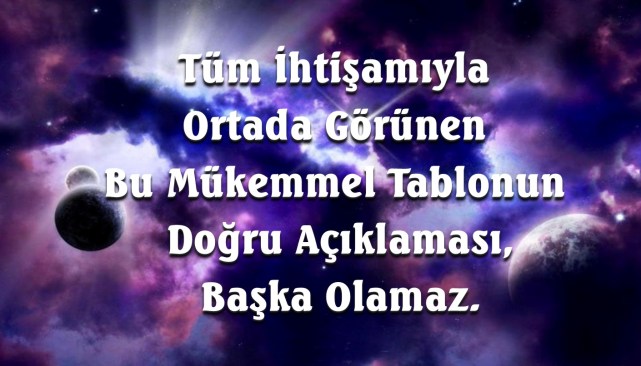Tüm ihtişamıyla ortada görünen bu mükemmel tablonun doğru açıklaması, başka olamaz. Böyle bir kabul, göz önünde görünen bu durum karşısında yapılacak en mantıklı ve bilimsel nitelikte çıkarımdır. Eğer böyle olmamış olsaydı, 2 liraya aldığımız bir meyvenin, 200 liraya bile alamayacağımız kadar zor bulunması gerektiğini, hatta belki o meyvenin oluşma imkânı bile bulamayacağını tahmin etmek hiç de güç görünmüyor.