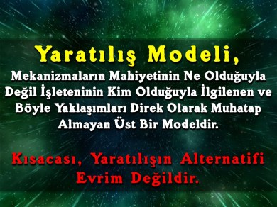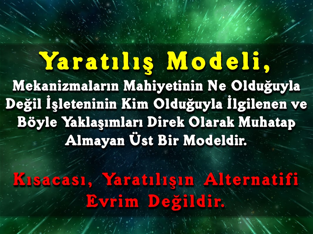 Yanlış anlamaları önlemek için başta belirtmek isteriz ki, bu bölümde vurgulanan husus, evrimin bir gerçek olması durumunda bile yaratıcı ihtiyacını ortaya kaldırmayacağı ve yaratılışa bir alternatif olamayacağı ve evrimin bir işletim mekanizmasının açıklamasından fazla bir kıymetinin olmadığıdır. Yazımızda ilk planda yanlış anlaşılabilecek cümleler, sonraki cümle ve cümlelerde açık kapı bırakmayacak şekilde açıklığa kavuşturulmuştur. Yaratıcıyı reddetmeyen bir evrim yaklaşımını kabul etmeme ve hatta bilimsel nitelikten uzak görme gerekçelerimiz ise, yazımızın sonunda verilen kaynak kitabımız Tabiat Risalesi Açılımları içinde detaylı olarak açıklanmıştır. Evrim, canlıların “meydana geliş ve işleyiş mekanizmaları” noktasında (kurgusal nitelik arz eden ve bilimsel bir teoriden çok bir bilim kurgu hikayesi niteliğindeki) alternatif bir teoridir. Mekanizmanın ise şu veya bu olması, meydana gelen canlının bir yaratıcısının olup olmaması veya tesadüfen oluşup oluşmadığı konusunda bağımsız bir değişkendir. Yani canlıların meydana gelmesinde bir evrim mekanizması işliyor olsaydı bile, bu durum yaratıcının gerekliliğinin ortadan kalkmasını netice vermeyecekti. Öncelikle bunu ortaya koymak gerekiyor. (İnceleme ve analiz için söylenen bu cümlenin hüküm cümlesi gibi anlaşılmaması gerektiğini belirtmek isteriz.)