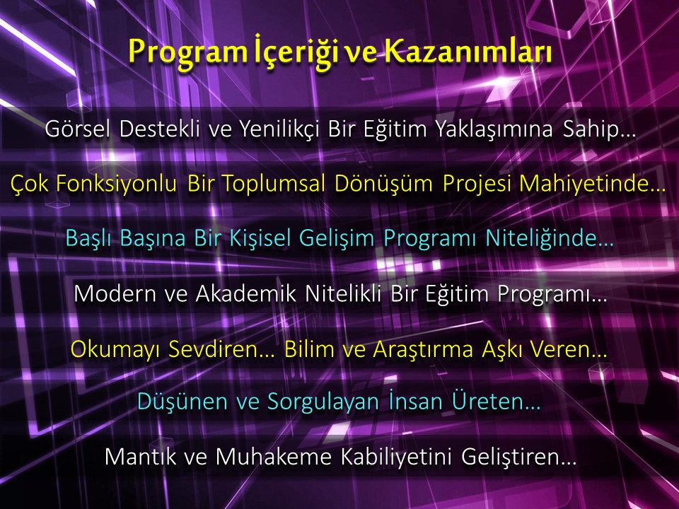 Görsel destekli ve yenilikçi bir eğitim yaklaşımına sahip… Çok fonksiyonlu bir toplumsal dönüşüm projesi mahiyetinde… Başlı başına bir kişisel gelişim programı niteliğinde… Modern ve akademik nitelikli bir eğitim programı…
