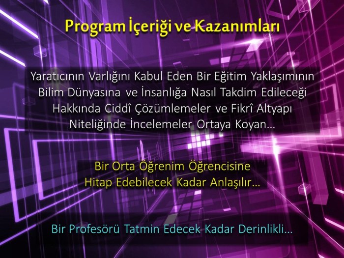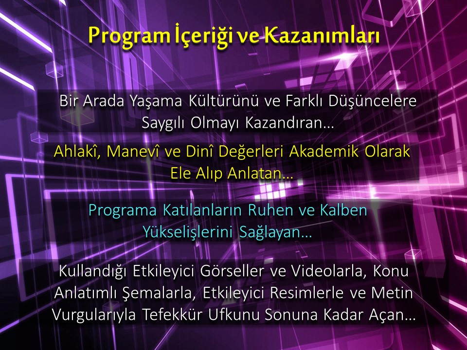 Ahlakî, manevî ve dinî değerleri akademik olarak ele alıp anlatan… Programa katılanların ruhen ve kalben yükselişlerini sağlayan… Kullandığı etkileyici görseller ve videolarla, konu anlatımlı şemalarla, etkileyici resimlerle ve metin vurgularıyla tefekkür ufkunu sonuna kadar açan…