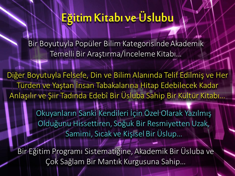 Bir boyutuyla popüler bilim kategorisinde akademik temelli bir araştırma/inceleme kitabı… Diğer boyutuyla felsefe, din ve bilim alanında telif edilmiş ve her türden ve yaştan insan tabakalarına hitap edebilecek kadar anlaşılır ve şiir tadında edebî bir üsluba sahip bir kültür kitabı…