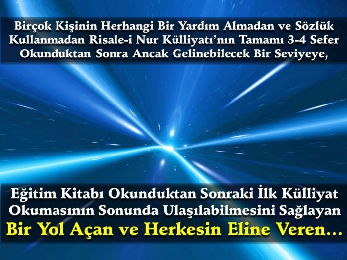Ve birçok kişinin herhangi bir yardım almadan ve sözlük kullanmadan Risale-i Nur Külliyatı’nın tamamını 3-4 sefer okuduktan sonra ancak gelebileceği bir seviyeye, (eserlerin orijinal metnini, okuyucuya özel olarak hazırlanmış bir izah metni ve kavramlar sözlüğüyle okutan) bu eğitim kitabını okuduktan sonraki ilk külliyat okumasının sonunda (kullanılan teknik ve sistematiğin aslında şaşırılmaması gereken normal bir neticesi olarak) ulaşabilmesini sağlayan bir yol açan ve herkesin eline veren…