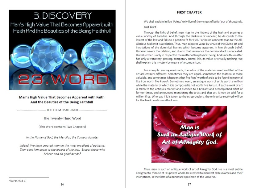 This work is a part of our basic/source book called “A Journey of Discovery for an Extraordinary Treasure: Risale-i Nur (The Treatise of Light) Training Program” upon which our “Journeys of Discovery, Risale-i Nur Training Program” is constructed and it is “Man’s High Value That Becomes Apparent with Faith and the Beauties of the Being Faithfull”, which is the third discovery of the five discovery, dealt with in the first main part of that book, which is called “Discovering the Value of the Treasure of Faith”.