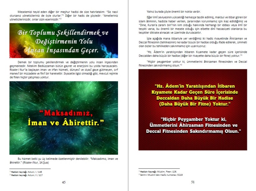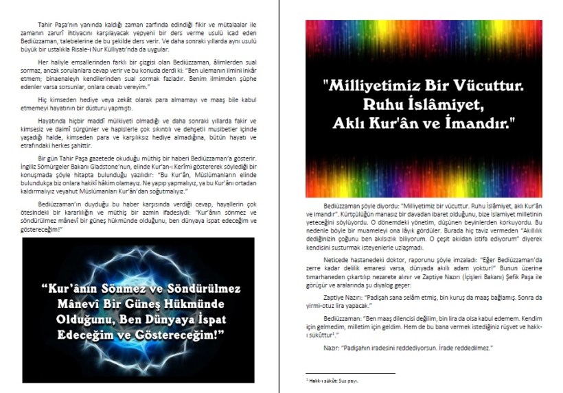 6- Netice olarak, sayılan özellikler nedeniyle bu yeni tarihçe çalışması gerçekten çok fonksiyonlu bir hizmet aracı olarak karşınıza çıkmıştır. Ahirzamanın önemli şahsiyetlerinin tanınmasında, Risale-i Nur’un okunmasının ve derslerine gidilmesinin öneminin anlatılmasında her düşüncedeki insanı rahatlıkla ikna edebilecek kadar sağlam bir mantık kurgusuna sahip olan bu küçük ama kabiliyeti büyük çalışmayı, Risale-i Nur’a gönül veren herkesin kuvvetli bir hizmet aracı olarak kullanması gerektiğine inanıyoruz.