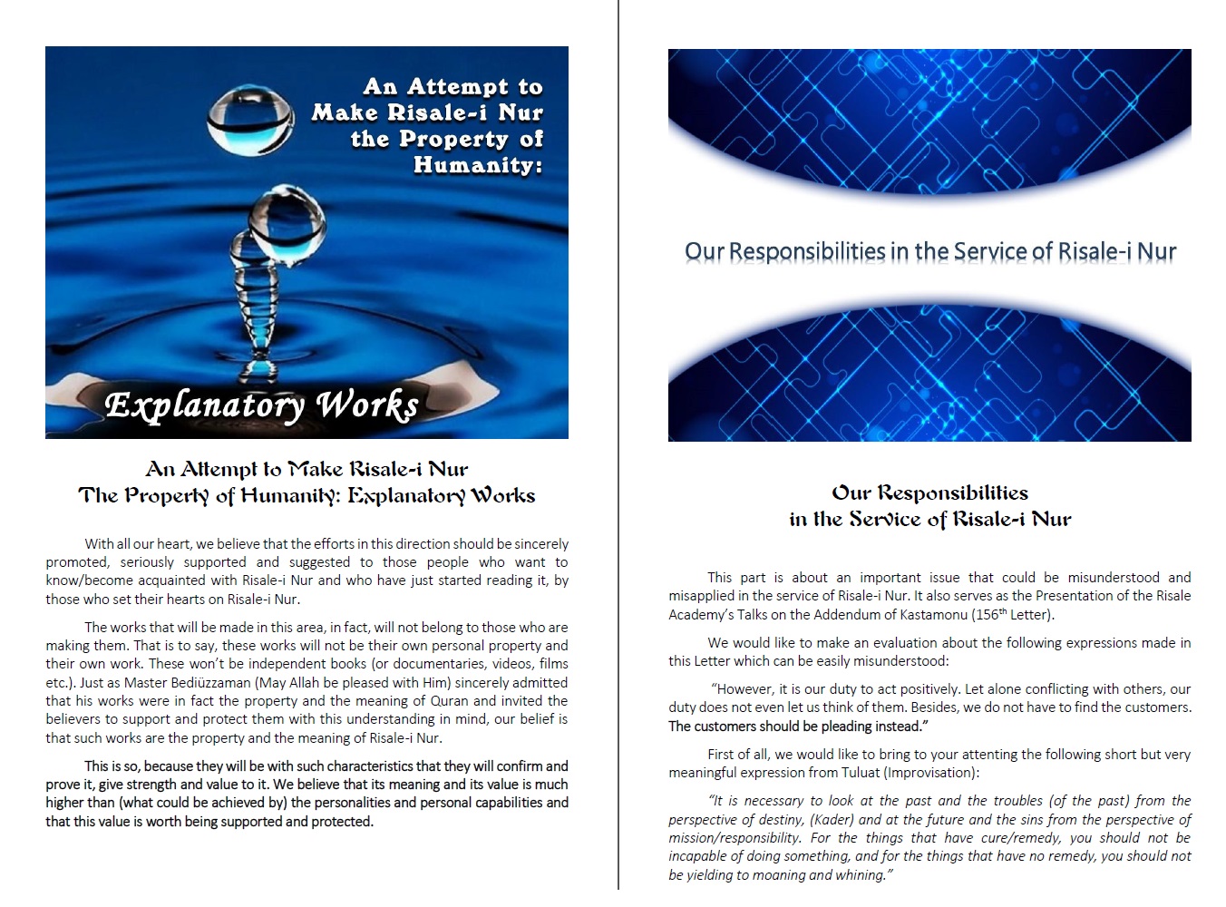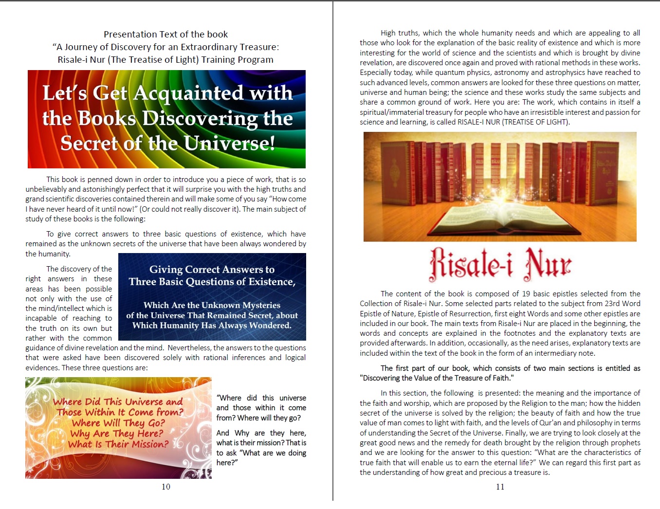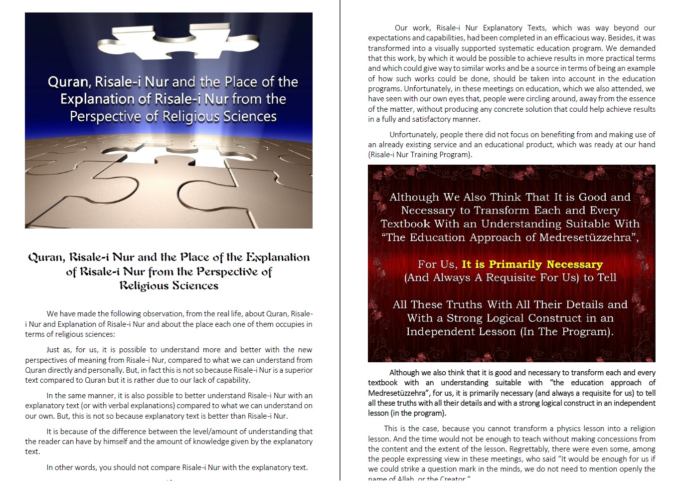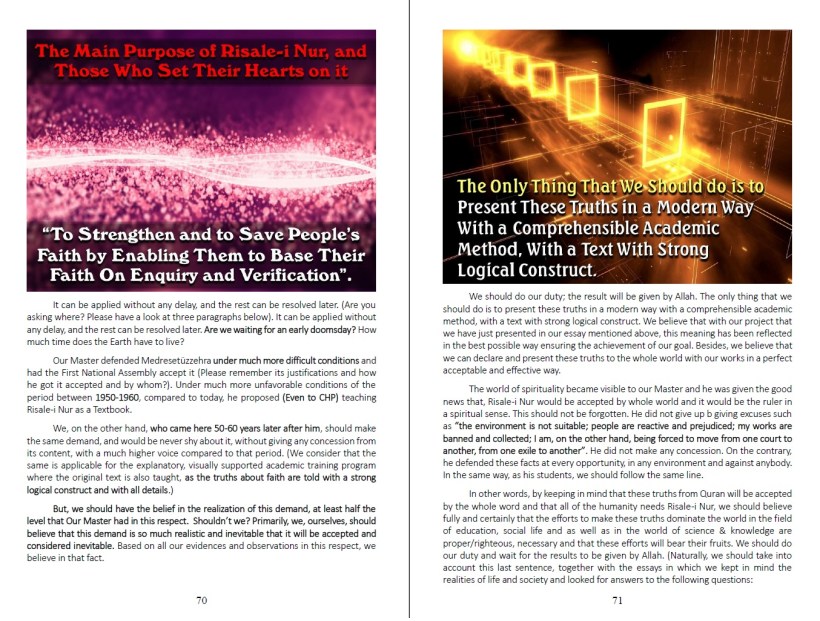 In our book, where we provide serious answers to very important questions that we enumerate below, detailed studies are made about what can be done in order to make Risale-i Nur and the Quranic truths contained in it the property of the humanity; solutions are proposed; and concrete works which have been realized are presented.
