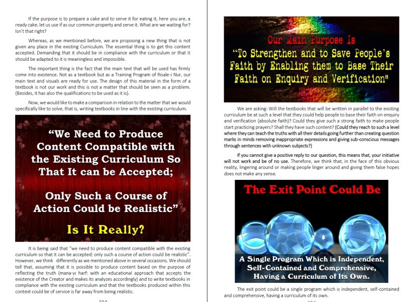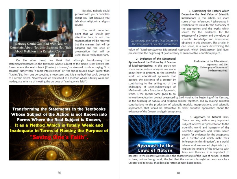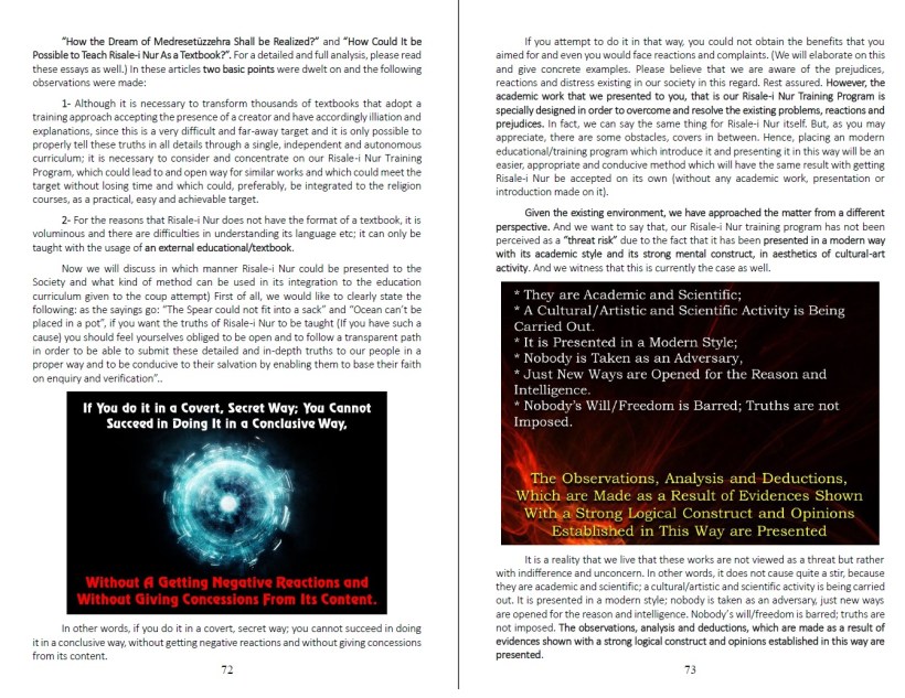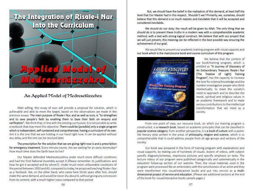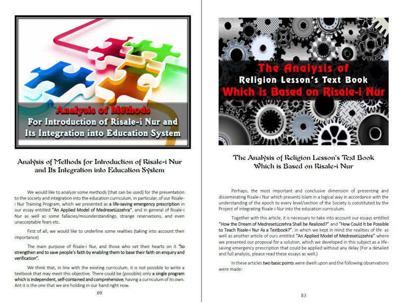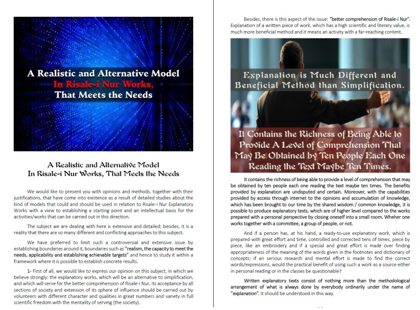 In our book, where we provide serious answers to very important questions that we enumerate below, detailed studies are made about what can be done in order to make Risale-i Nur and the Quranic truths contained in it the property of the humanity; solutions are proposed; and concrete works which have been realized are presented.