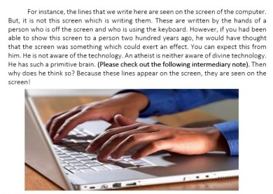 For instance, the lines that we write here are seen on the screen of the computer. But, it is not this screen which is writing them. These are written by the hands of a person who is off the screen and who is using the keyboard. However, if you had been able to show this screen to a person two hundred years ago, he would have thought that the screen was something which could exert an effect. You can expect this from him. He is not aware of the technology. An atheist is neither aware of divine technology. He has such a primitive brain. (Please check out the following intermediary note). Then why does he think so? Because these lines appear on the screen, they are seen on the screen!