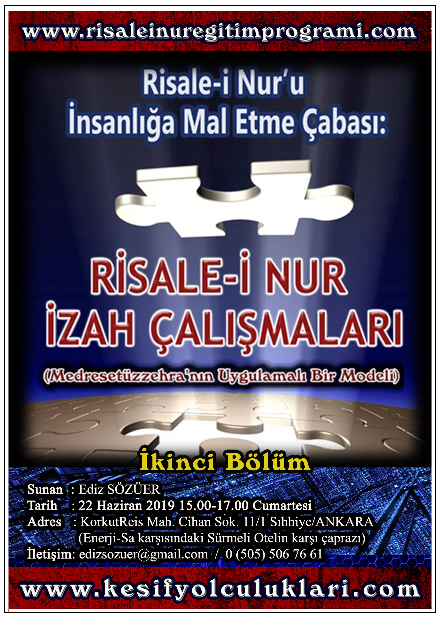 Keşif Yolculukları Risale-i Nur Eğitim Programı’mızın ek bölümleri içine alınan ve “Risale-i Nur’u İnsanlığa Mal Etme Çabası: İzah Çalışmaları” isimli kitapla aynı içeriğe sahip olan bölümlerin, eğitim programının bir parçası olarak görsel destekli seminerlerle sunulması planlanmıştır.