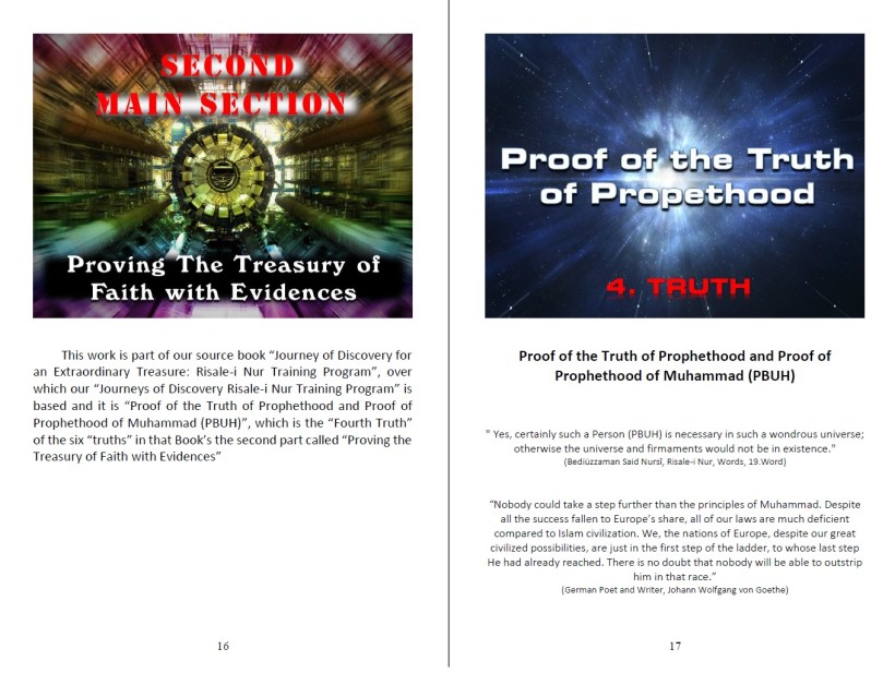 This work is part of our source book “Journey of Discovery for an Extraordinary Treasure: Risale-i Nur Training Program”, over which our “Journeys of Discovery Risale-i Nur Training Program” is based and it is “Proof of the Truth of Prophethood and Proof of Prophethood of Muhammad (PBUH)”, which is the “Fourth Truth” of the six “truths” in that Book’s the second part called “Proving the Treasury of Faith with Evidences”
