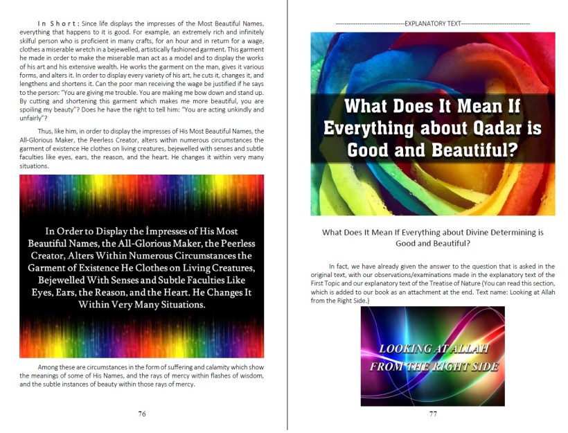 The second part of the book is entitled as ” Proving the Existence of the Treasure of Faith with Evidences”. In this section, six pillars of faith are proved with detailed evidences. In other words, in the second section, the existence of the treasure sought to be achieved, whose value is understood/appreciated in the first section, is proved; its place is discovered, and this great and magnificent treasure is acquired. Primarily understanding that faith is such a great blessing and a treasure with a great value would determine the importance that we would give to that treasure and its evidences. Nevertheless, you will also observe that in the first part, a serious effort has also been made to search for the truth and evidences. Once you complete the book, you will have completed an important reading that could be considered as a brief summary of the Risale-i Nur collection and taken a serious step in studying the high knowledge of faith that is taught by these works.