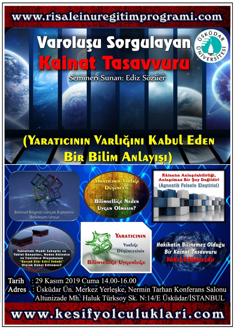 29 Kasım 2019 Cuma 14.00-16.00’da Üsküdar Üniversitesi Merkez Yerleşkesi Nermin Tarhan Konferans Salonu’nda sunulacak “Varoluşu Sorgulayan Kainat Tasavvuru (Yaratıcının Varlığını Kabul Eden Bir Bilim Anlayışı)” isimli özel seminer programına davetlisiniz.