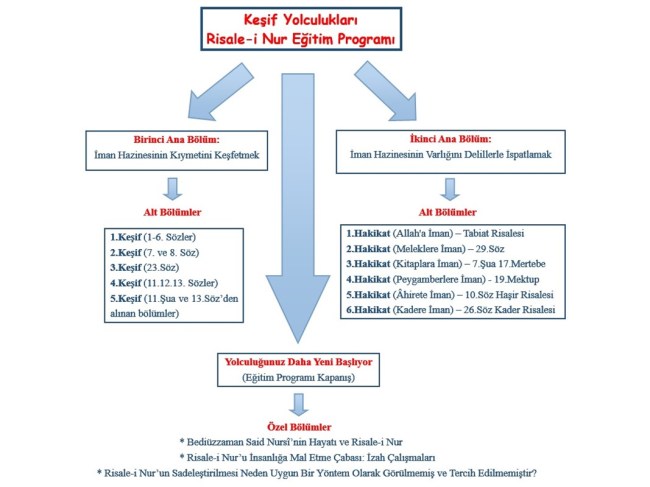 Varoluşun üç temel sorusuna en doğru ve en kapsamlı cevapları veren ve İslam’ı çağın anlayışına en uygun ve aklî şekilde takdim eden Risale-i Nur’u insanlarımızla tanıştırmak maksadıyla hazırlanan “Görsel Destekli ve Akademik Nitelikli Keşif Yolculukları Risale-i Nur Eğitim Programı”mızın içeriğinin; bilim sevgisinin ve entellektüel düşünen, araştırmacı insanın arttırılmasına ve ayrıca ahlakî, manevî ve dinî değerlerin akademik olarak ele alınıp anlatılmasına yönelik toplumsal ihtiyacı karşılama ve insanlık olarak muhtaç olduğumuz zihinsel dönüşüme ciddî katkılar sağlama kabiliyetinde olduğuna inanıyoruz. Eğitim programımızın içeriği iki ana bölümden oluşuyor.