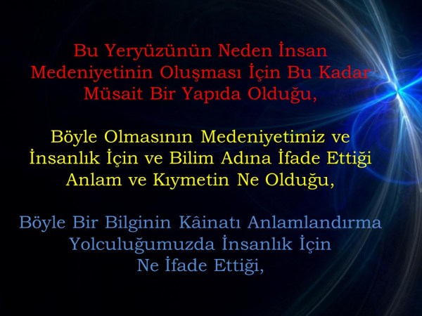 Bu yeryüzünün neden insan medeniyetinin oluşması için bu kadar müsait bir yapıda olduğu, böyle olmasının medeniyetimiz ve insanlık için ve bilim adına ifade ettiği anlam ve kıymetin ne olduğu, böyle bir bilginin kâinatı anlamlandırma yolculuğumuzda insanlık için ne ifade ettiği ve