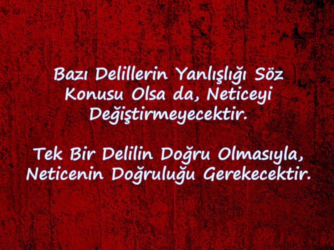 Çünkü bazı delillerin yanlışlığı söz konusu olsa da, neticeyi değiştirmeyecektir ve tek bir delilin doğru olmasıyla, neticenin doğruluğu gerekecektir. İddianın doğruluğu ortaya çıkınca da, diğer tüm şüphelerin ve karşıt delillerin de bizce meçhul izahları ve nedenleri çözümlenmiş sayılacak ve elbette hükümsüz kalacaklardır. Aksine ihtimal vermek, mantıken imkânsızdır. Yani inanan bir insanın, inkârcıların bütün şüphelerinin doğru izahlarını, bütün sorularının cevaplarını bilme zorunluluğu ve mecburiyeti yoktur!