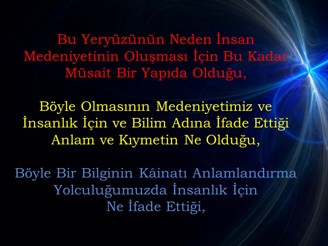 Bu yeryüzünün neden insan medeniyetinin oluşması için bu kadar müsait bir yapıda olduğu, böyle olmasının medeniyetimiz ve insanlık için ve bilim adına ifade ettiği anlam ve kıymetin ne olduğu, böyle bir bilginin kâinatı anlamlandırma yolculuğumuzda insanlık için ne ifade ettiği ve