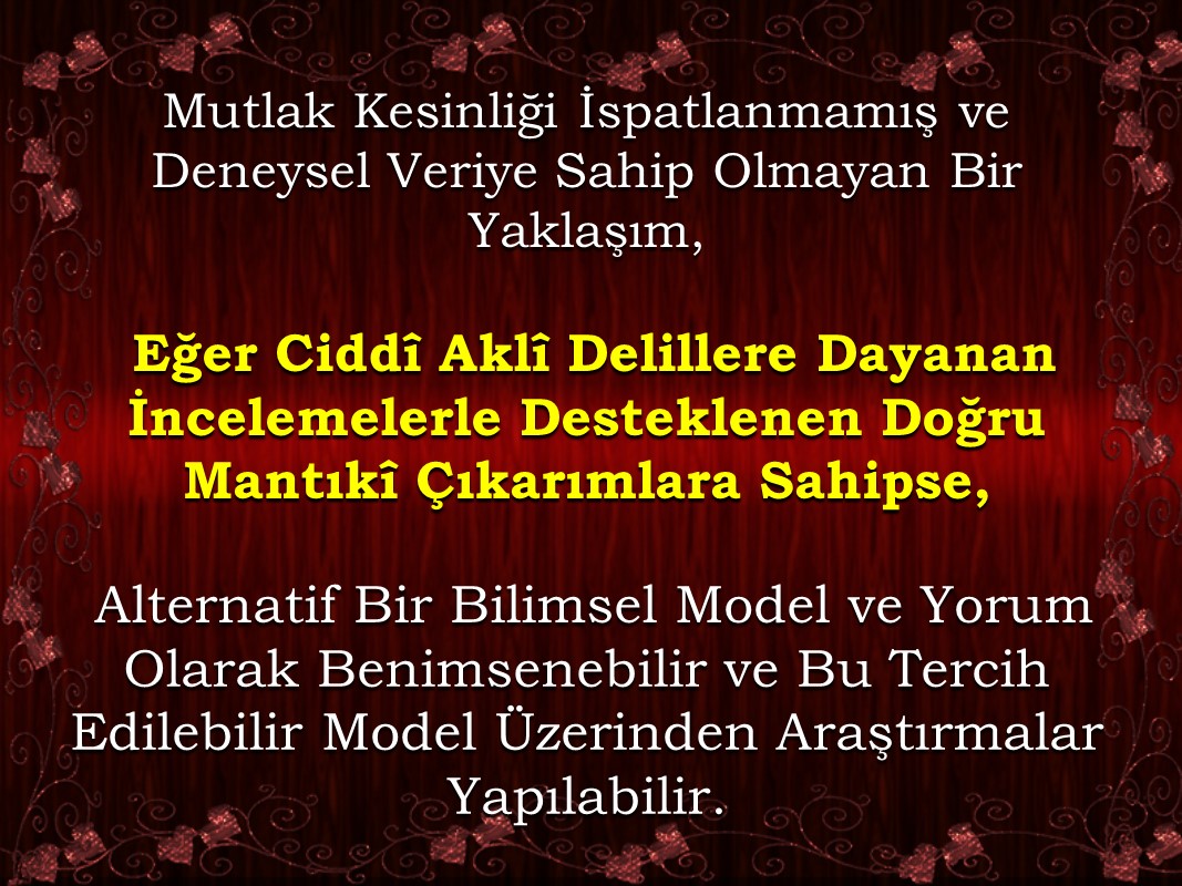 Mutlak kesinliği ispatlanmamış ve deneysel veriye sahip olmayan bir yaklaşım ise, eğer ciddî aklî delillere dayanan incelemelerle desteklenen doğru mantıkî çıkarımlara sahipse, alternatif bir bilimsel model ve yorum olarak benimsenebilir ve bu tercih edilebilir model üzerinden araştırmalar yapılabilir.