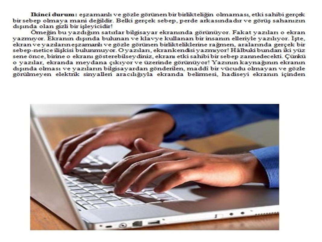 Olayı bilimsel olarak, akıl ve mantık temelinde incelemek istersek ne yapmamız gerekir? Bu noktada yapılması gereken, o ekranda yazı yazma kabiliyetinin olup olmadığına bakmak ve bunun çıkarımını yapmak. Bu kadar basit. Bunu -günümüzde yaşayan- en basit zihinli bir insan yapamaz mı? Elbette yapabilir. Fakat iki yüz sene öncesinden gelmiş bir profesör yapamaz. Modern teknolojiden anlamıyor çünkü. Günümüzde yaşayan ve modern teknolojiden anlayan beş yaşında bir çocuk bu çıkarımı yapar ama. Böyle çarpıcı bir farklılık var bakın. Yazının kaynağının ekranın dışında olması ve yazıların bilgisayardan gönderilen, maddî bir vücudu olmayan ve gözle görülmeyen elektrik sinyalleri aracılığıyla ekranda belirmesi, hâdiseyi ekranın içinden seyreden birine göre sebebi manevî olan bir olaydır denilebilir. Çünkü gerçek sebep, maddî gözle görünmüyor. Böyle bir şey hayal edin, çizgi filmlerdeki gibi ekranın içinde küçük adamcıklar olduğunu düşünün. Bu çok ince noktaya dikkat rica ediyoruz.
