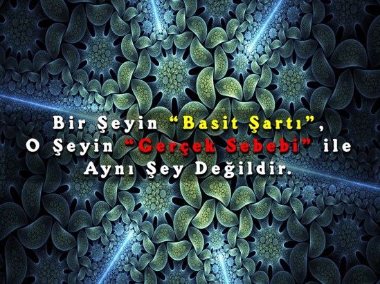 Evet, bir eşyanın varlığı, çok sayıda şartın bir arada olmasına bağlı olabilir. Bir tek şartın yokluğu, o eşyanın yokluğunu netice veriyor diye; o tek şartın eşyanın var olması için yeterli sebep olduğu söylenemez. Yani, bir şeyin “basit şartı”, o şeyin “gerçek sebebi” ile aynı şey değildir.