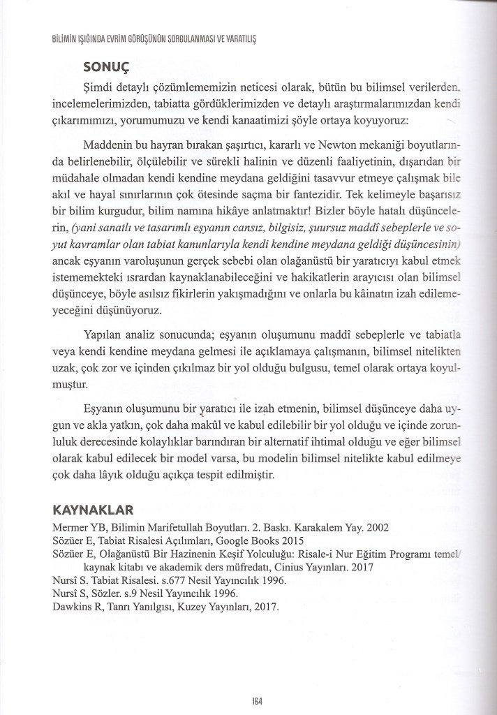 Maddenin bu hayran bırakan şaşırtıcı, kararlı ve Newton mekaniği boyutlarında belirlenebilir, ölçülebilir ve sürekli halinin ve düzenli faaliyetinin, dışardan bir müdahale olmadan kendi kendine meydana geldiğini tasavvur etmeye çalışmak bile akıl ve hayal sınırlarının çok ötesinde saçma bir fantezidir, tek kelimeyle başarısız bir bilimkurgudur, bilim namına hikâye anlatmaktır! Bizler böyle hatalı düşüncelerin, (yani sanatlı ve tasarımlı eşyanın cansız, bilgisiz, şuursuz maddî sebeplerle ve soyut kavramlar olan tabiat kanunlarıyla kendi kendine meydana geldiği düşüncesinin) ancak eşyanın varoluşunun gerçek sebebi olan olağanüstü bir yaratıcıyı kabul etmek istememekteki ısrardan kaynaklanabileceğini ve hakikatlerin arayıcısı olan bilimsel düşünceye, böyle asılsız fikirlerin yakışmadığını ve onlarla bu kâinatın izah edilemeyeceğini düşünüyoruz.