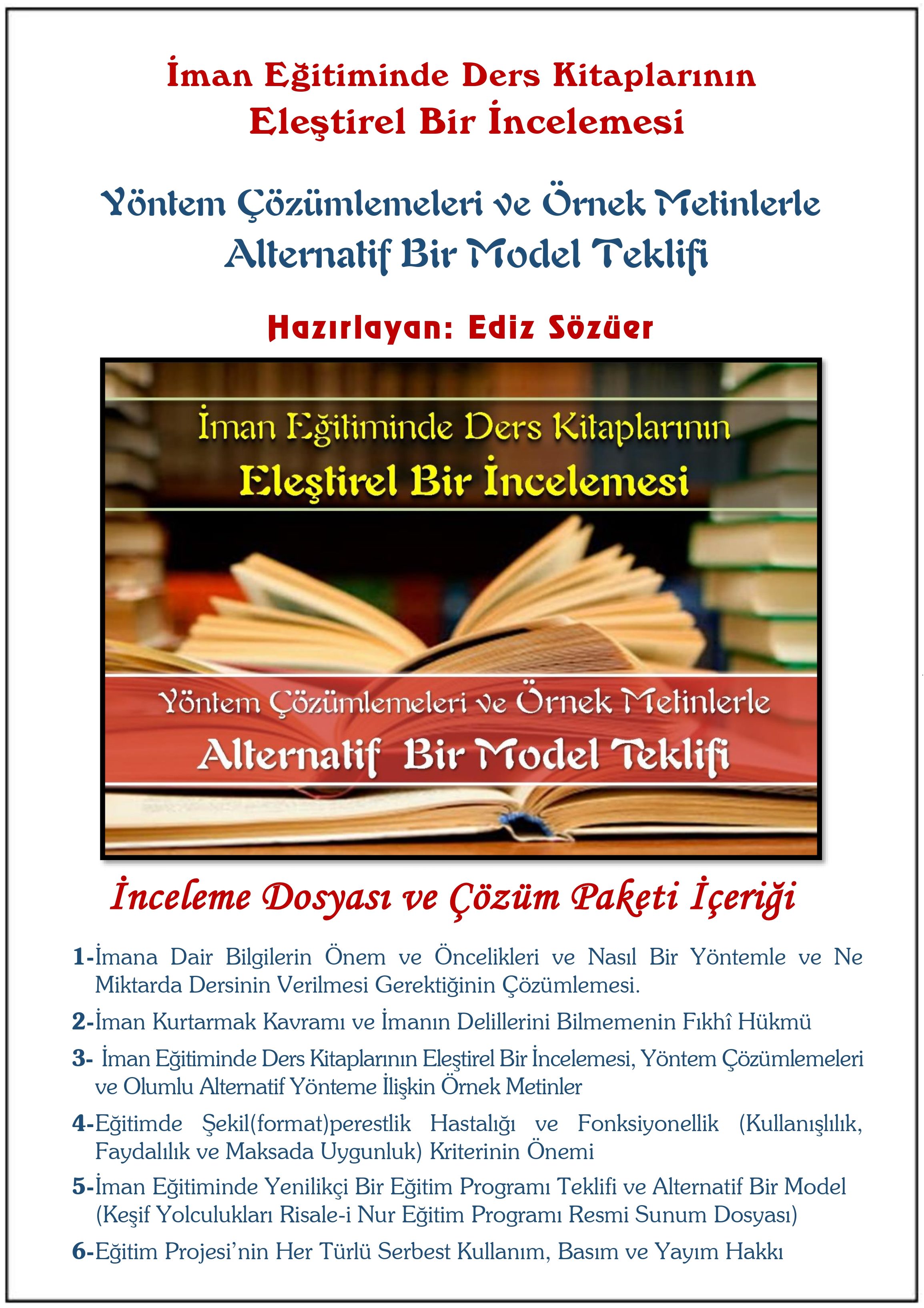İman eğitimi konusundaki kapsamlı içeriği sebebiyle, bir kaynak/rehber eğitim kitabı mahiyetinde olan “İman Eğitiminde Ders Kitaplarının Eleştirel Bir İncelemesi, Yöntem Çözümlemeleri ve Örnek Metinlerle Alternatif Bir Model Teklifi” isimli bu inceleme dosyası, ilköğretimden ilahiyat fakültesine kadar (ilahiyat fakültesi dahil olmak üzere) okutulan hiçbir din dersi kitabında “bir insanın şüphesiz ve tereddütsüz olarak yani makbul bir şekilde iman edebilmesi için, kayda değer hiçbir içerik sunulmadığını ve bu yöndeki ihtiyacı karşılayacak hiçbir dersin verilmediğini” kesin olarak ortaya çıkarmıştır. Söz konusu kitapların, “iman esaslarından sadece bahsettiklerini” ve “iman esaslarının dersini vermediklerini ve tüm detaylarıyla ve sağlam bir mantık kurgusuyla delile ve araştırmaya dayalı olarak anlatmadıklarını” çarpıcı şekilde göstermiştir.
