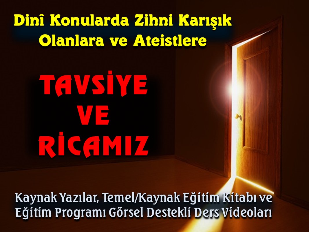 Önemli Bilgilendirme: Eğitim programımıza başlayacaklara, dinî konularda zihni karışık olanlara ve ateistlere, her şeyden önce bir temel alt yapı niteliğindeki bu kaynak yazıyı okumalarını ve yazıda adresi verilen seminerlerin metinlerini okumakla birlikte (pekiştirme metodunun faydası ve ekstra diyaloglar için) muhakkak videolarını da atlamadan izlemelerini tavsiye ve rica ediyoruz.